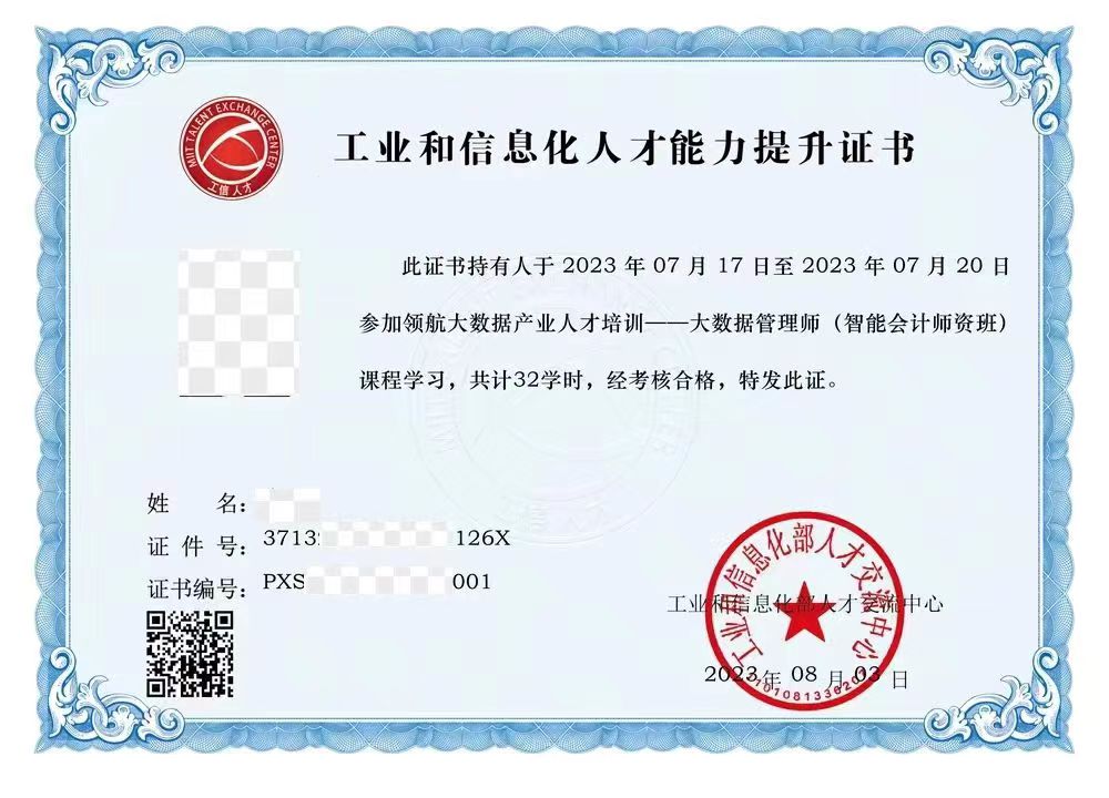 主要面向各类高等学校相关专业教师,包括普通本科院校、高职和中职院校教师及相关人员。主要学习《智能会计概论》、《智能账务》、《智能财务》、《智能决策》和《智能会计实训系统》,计32-40学时。由工信部人才交流中心,或研究会,或中企数智颁发证书。参考样本如下: