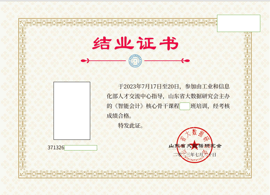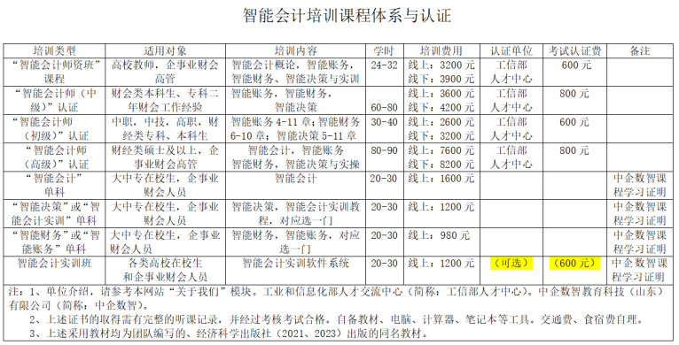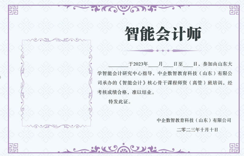 报名参加“智能会计师资”培训班、“智能会计”课程学习班、“智能会计师”(初级、中级、高级)培训班,线下或线上完成指定课程学习、有完整学习记录,经考核合格后颁发工信部人才交流中心,或山东省大数据研究会(https://www.sdbdra.cn/,以下简称“研究会”),或中企数智教育科技(山东)有限公司(http://zhongqishuzhi.com,以下简称“中企数智 )颁发的“智能会计师资班”或“智能会计”课程结业证,或颁发《智能会计师》(初级、中级、高级)证书。