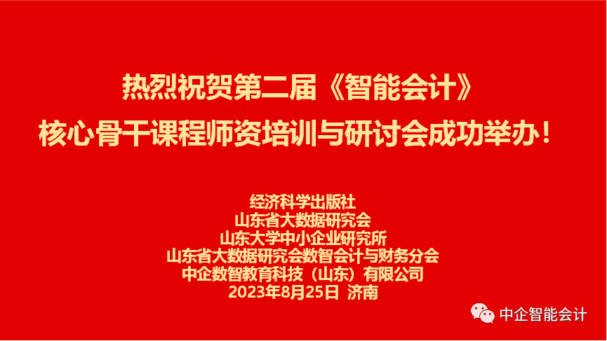 智能会计是传统会计转型升级的方向!围绕各高校智能会计学科建设所面临的缺师资、缺教材、缺教学方案、缺实训系统和企事业单位财务会计数智化转型人才、软件、解决方案等资源匮乏问题,2023年8月23日——25日,由经济科学出版社、山东省大数据研究会等主办,中企数智教育科技(山东)有限公司采用线上承办的第二届培训和研讨会成功举办。