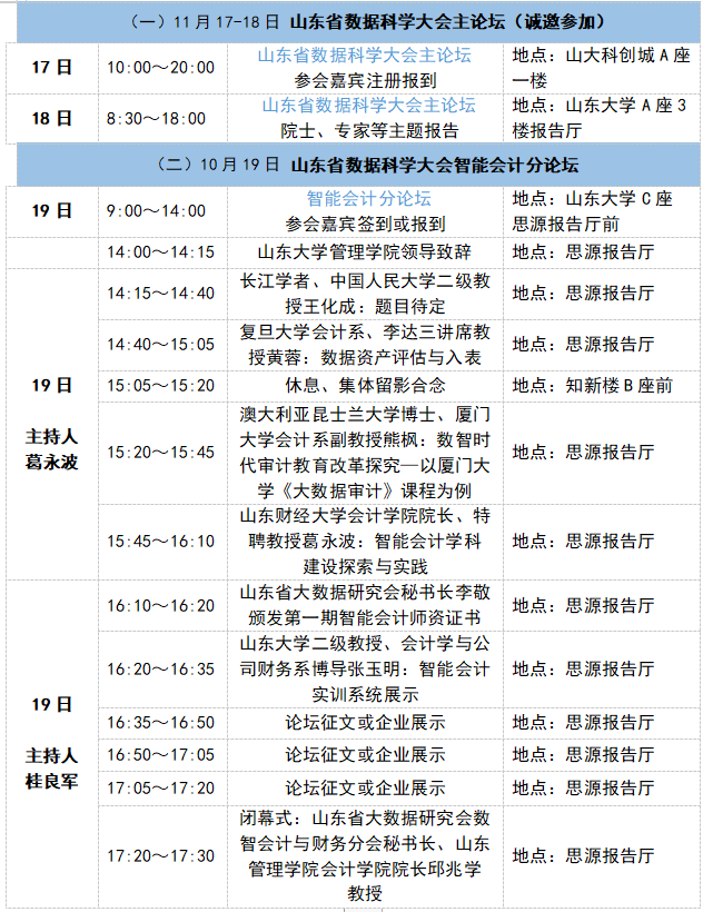 “大智移云物区环”支撑下的传统会计呈现快速数智化趋势,教育部、财政部印发《会计改革与发展“十四五”规划纲要》等文件推动会计职能拓展、数字化和智能化转型。为促进智能会计前沿理论研究、学科建设与发展,主办方定于11月19日举办“山东省数据科学大会智能会计论坛暨山东省大数据研究会数智会计与财务分会第二届年会”。会议由山东大学管理学院承办。会议主题:智能会计学科建设、数据资产估值与入表。会场-——山东大学中心校区知新楼C座思源厅。论坛由中国人民大学、复旦大学、厦门大学等智能会计和数据资产研究领域的权威专家、学科建设和行业专家做主题报告。
